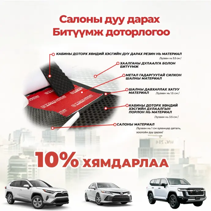 Авто доторлогоо, салоны дуу дарах үйлчилгээнүүдийг тус тус 10% хямдрууллаа.